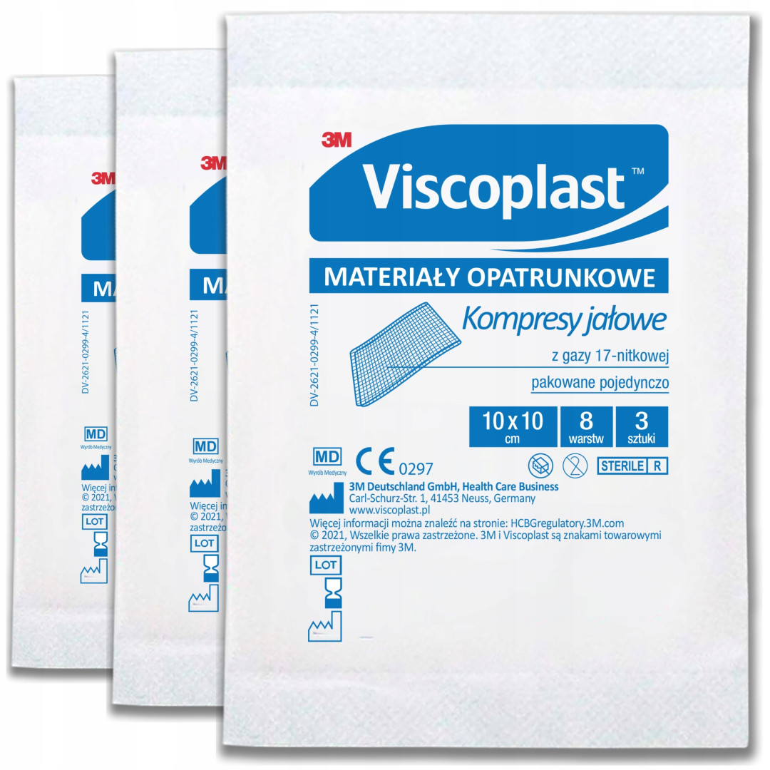 3M VISCOPLAST Jałowe kompresy gazowe 17-nitkowe, 8 warstw w rozmiarze 10cm x 10cm torebka 3szt (k=20)