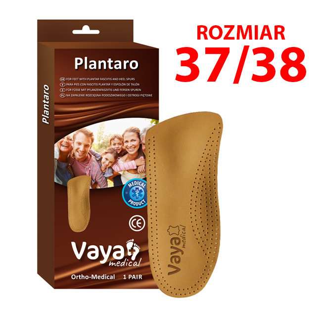 Wkładki ortopedyczne Vaya Plantaro to innowacyjne, skórzane wkładki wielokrotnego użycia, które zapewniają komfort stopom z zapaleniem rozcięgna podeszwowego lub ostrogą piętową. W tylnej części wkładki wbudowany został miękki amortyzujący krążek, który niweluje ból pięty oraz redukuje nacisk kości pięty na podłoże. Wkładka jest dostosowana do stóp z płaskostopiem. Obniżenie fizjologicznych łuków stopy jakie występuje przy płaskostopiu, jest redukowane dzięki wbudowanym elementom, pelocie i klinowi. Pelota wspiera łuk poprzeczny i rozluźnia mięśnie, więzadła i ścięgna. Klin podpierając łuk podłużny, rozkłada obciążenie stopy na podłoże. Wkładka odpowiednio amortyzuje i chroni piętę dzięki spodniej warstwie z naturalnego lateksu.